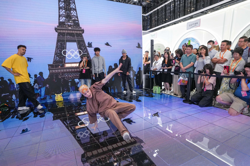 2024年9月14日,在2024年服貿(mào)會(huì)國(guó)家會(huì)議中心綜合展區(qū)的主賓國(guó)法國(guó)展臺(tái),中法兩國(guó)街舞好手在表演霹靂舞。新華社記者 陳曄華 攝